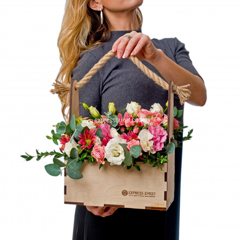 Эта восхитительная цветочная композиция в деревянном ящике такая яркая и современная. Нежные бутоны роз, кружевные лепестки эустом, ягоды...Само очарование!