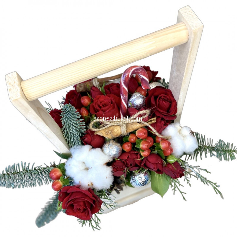 Кашпо Полукруг с высокой ручкой 17*17*35 ЦД (в ассортименте) - 1;Роза кустовая - 3;Роза 40 см - 1;Гиперикум - 2;Нобилис - 1;хлопок - 3;Шар ёлочный - 3;Оазис - 0.5;Конфета - 1;