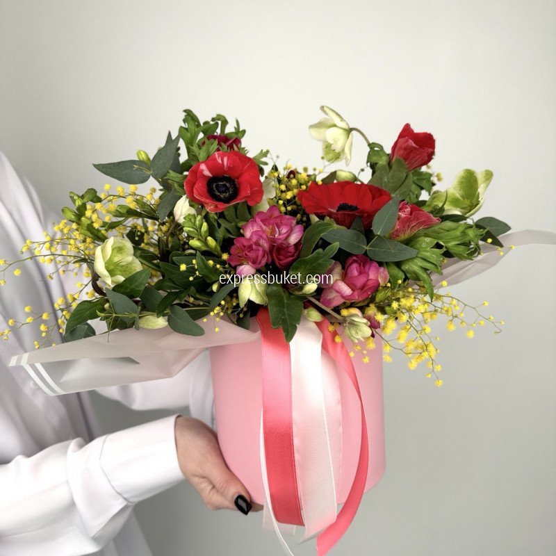 Коробка шляпная средняя (от 12 до 21 см) - 1;Оазис - 1;Фрезия - 5;мимоза - 1;Морозник - 5;Эвкалипт большой - 1;Анемон - 5;