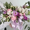 Альстромерия - 3;Вероника - 3;Гиперикум - 3;Фрезия - 1;Оазис - 1;Ранункулюс - 3;Эвкалипт большой - 1;Коробка шляпная средняя (от 12 до 21 см) - 1;